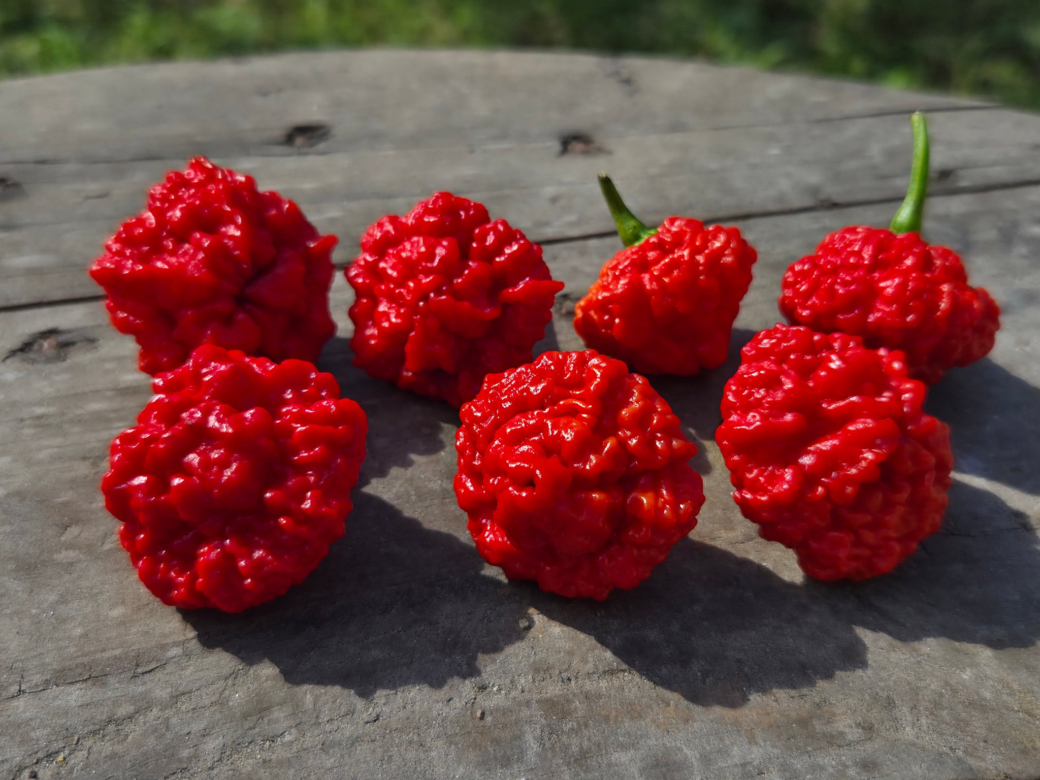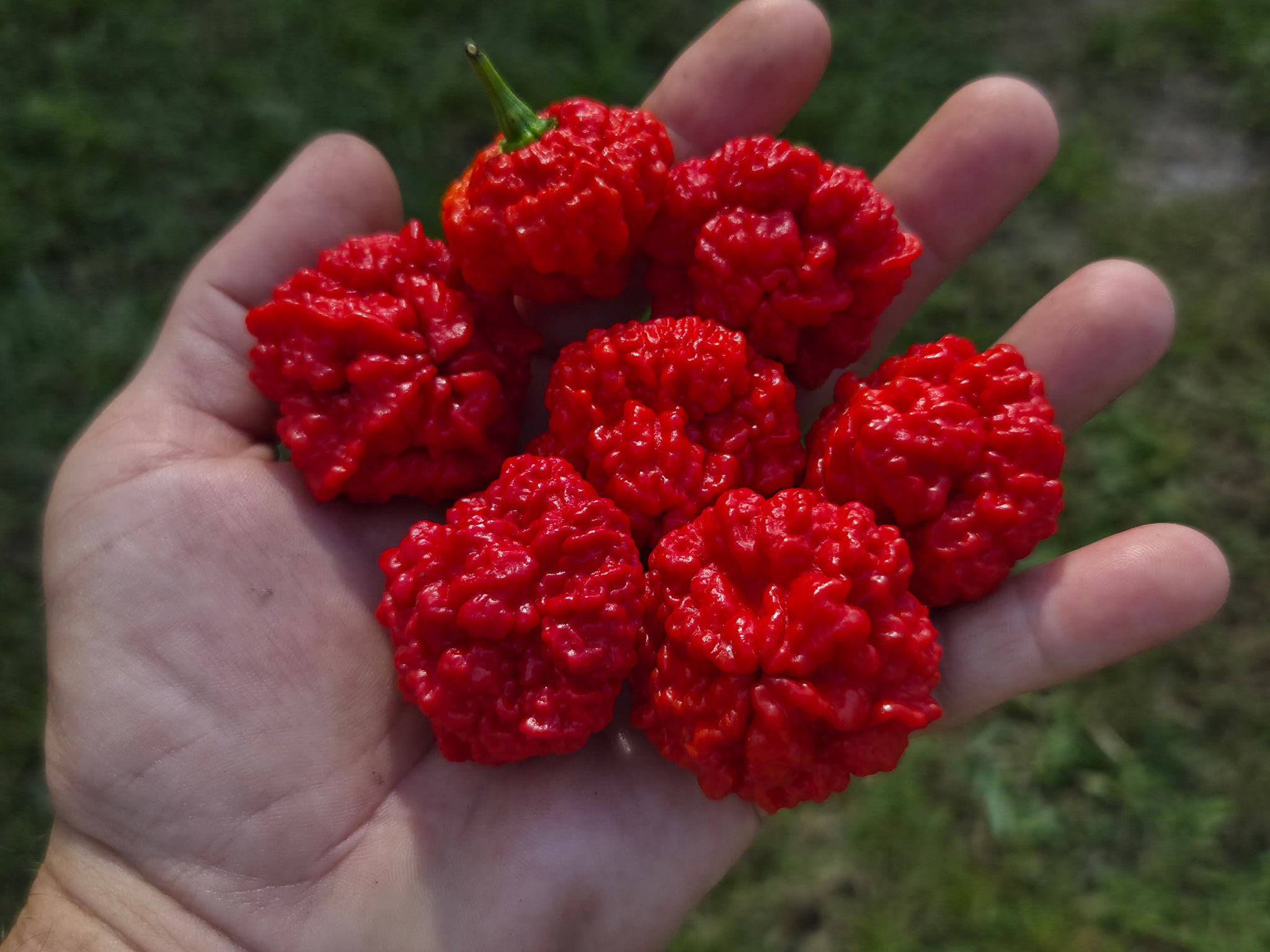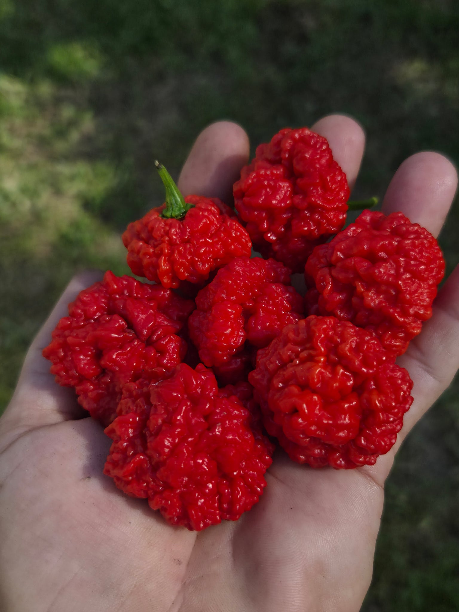 Patrick Mumford discovered this in his garden the following year after planting scotch bonnets and 7 Pot Jonah next to each other. Grown here at T-E for almost 10 years now, carrying on selection.