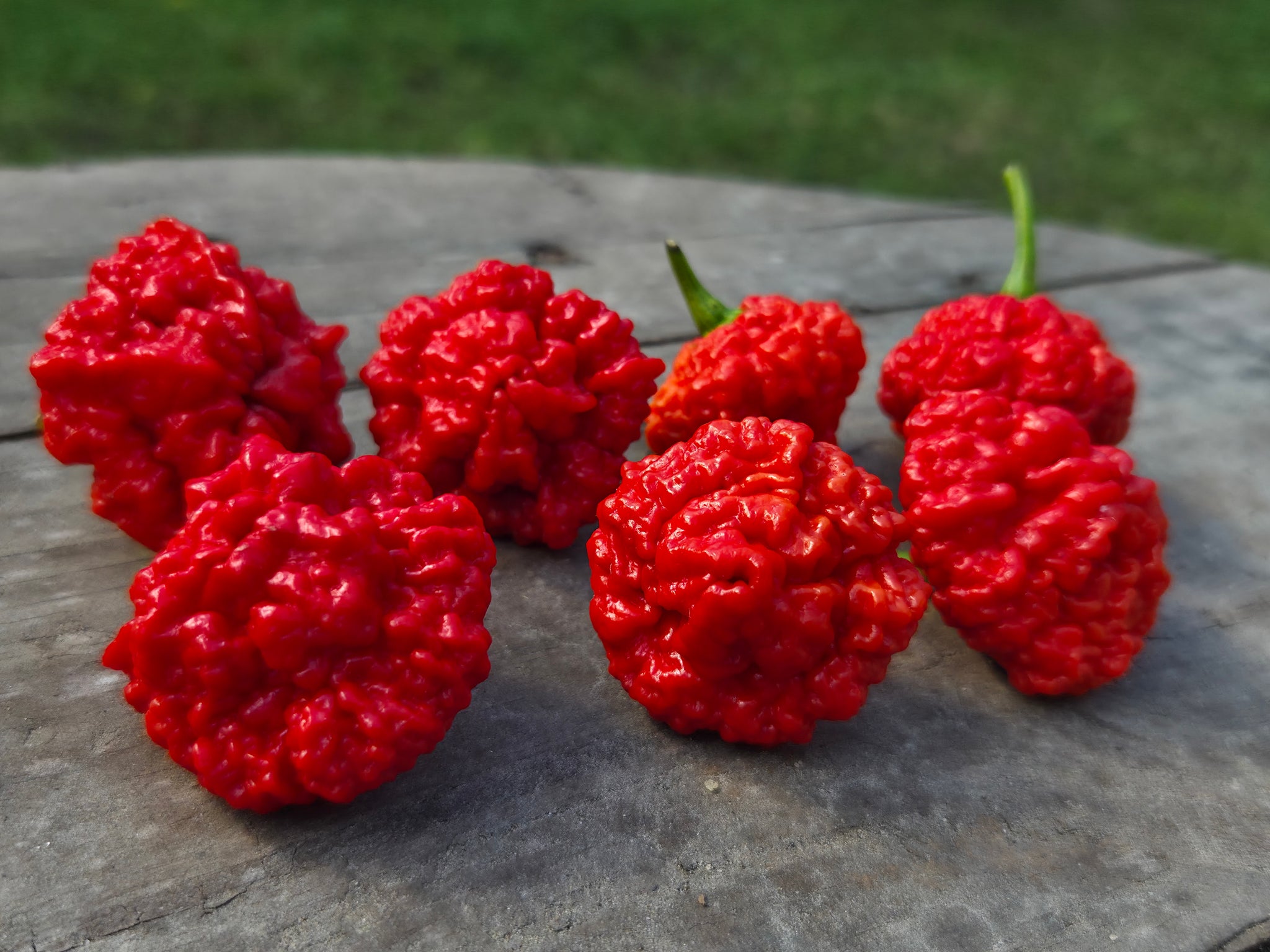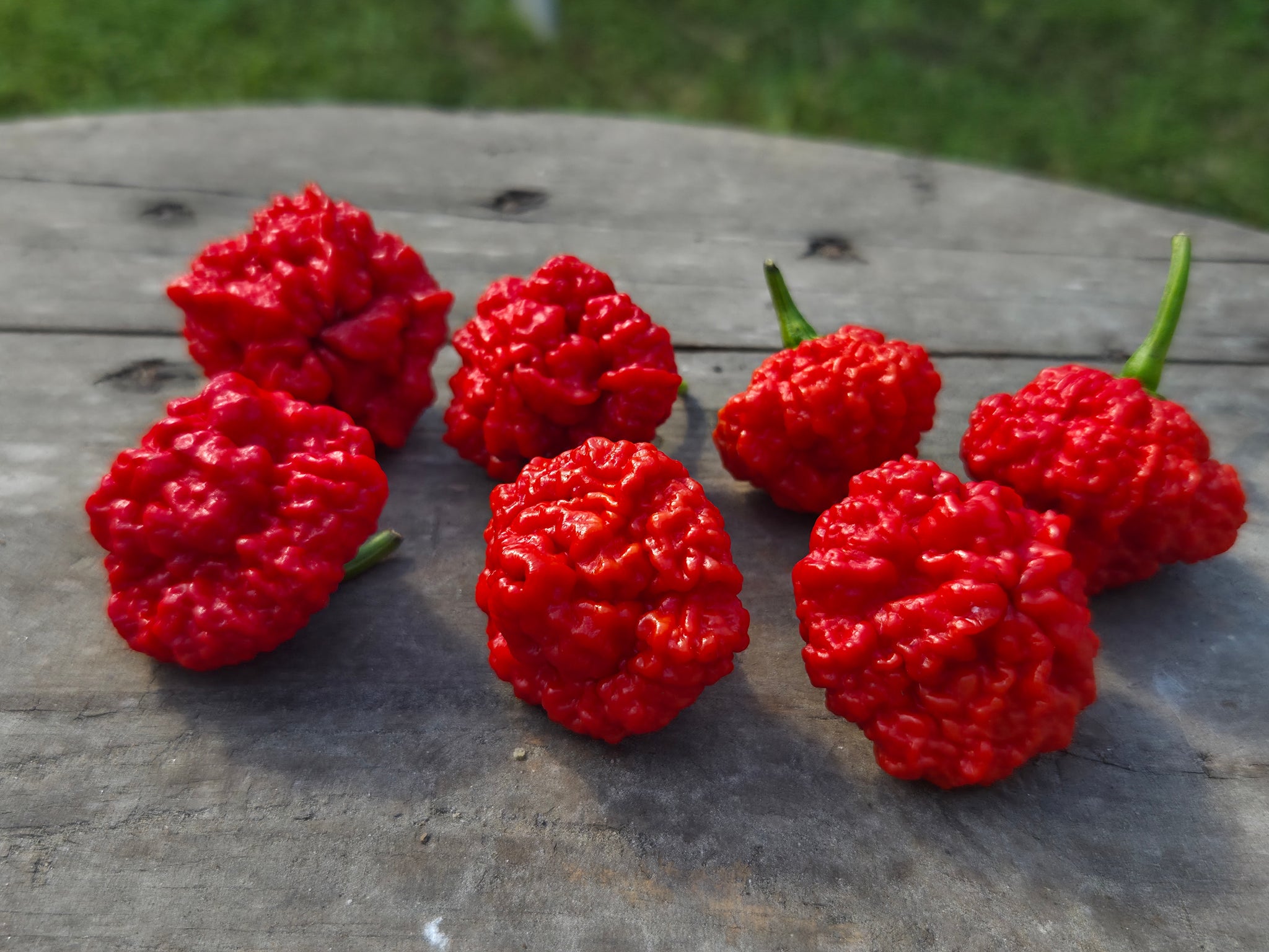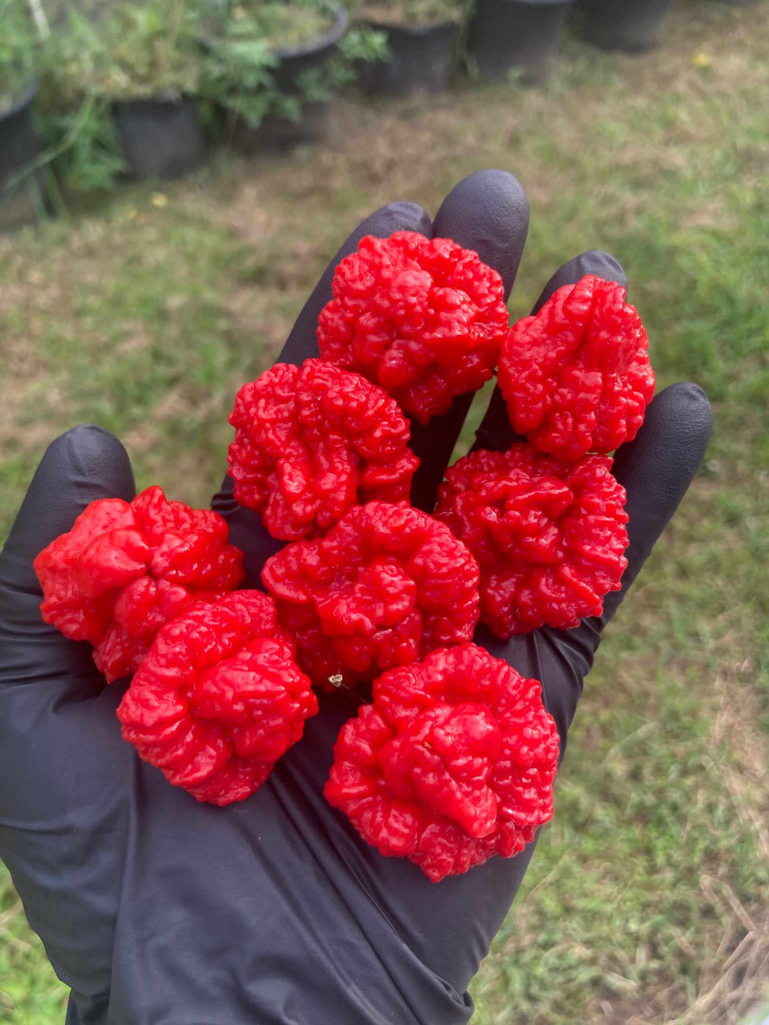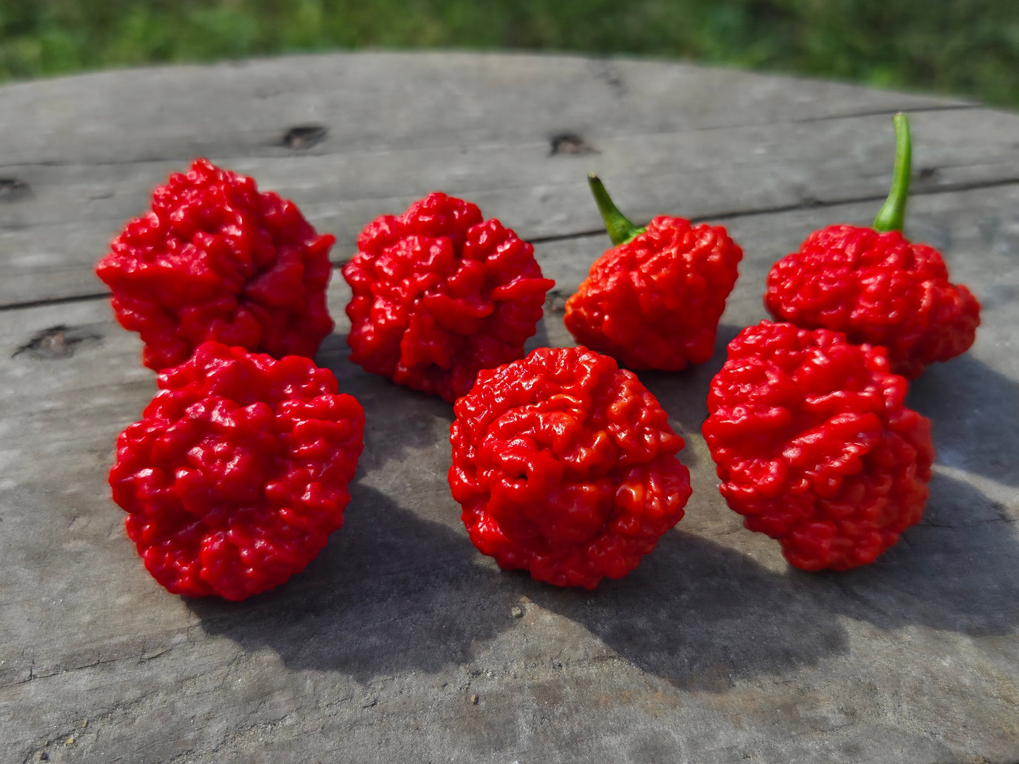 Patrick Mumford discovered this in his garden the following year after planting scotch bonnets and 7 Pot Jonah next to each other. Grown here at T-E for almost 10 years now, carrying on selection.