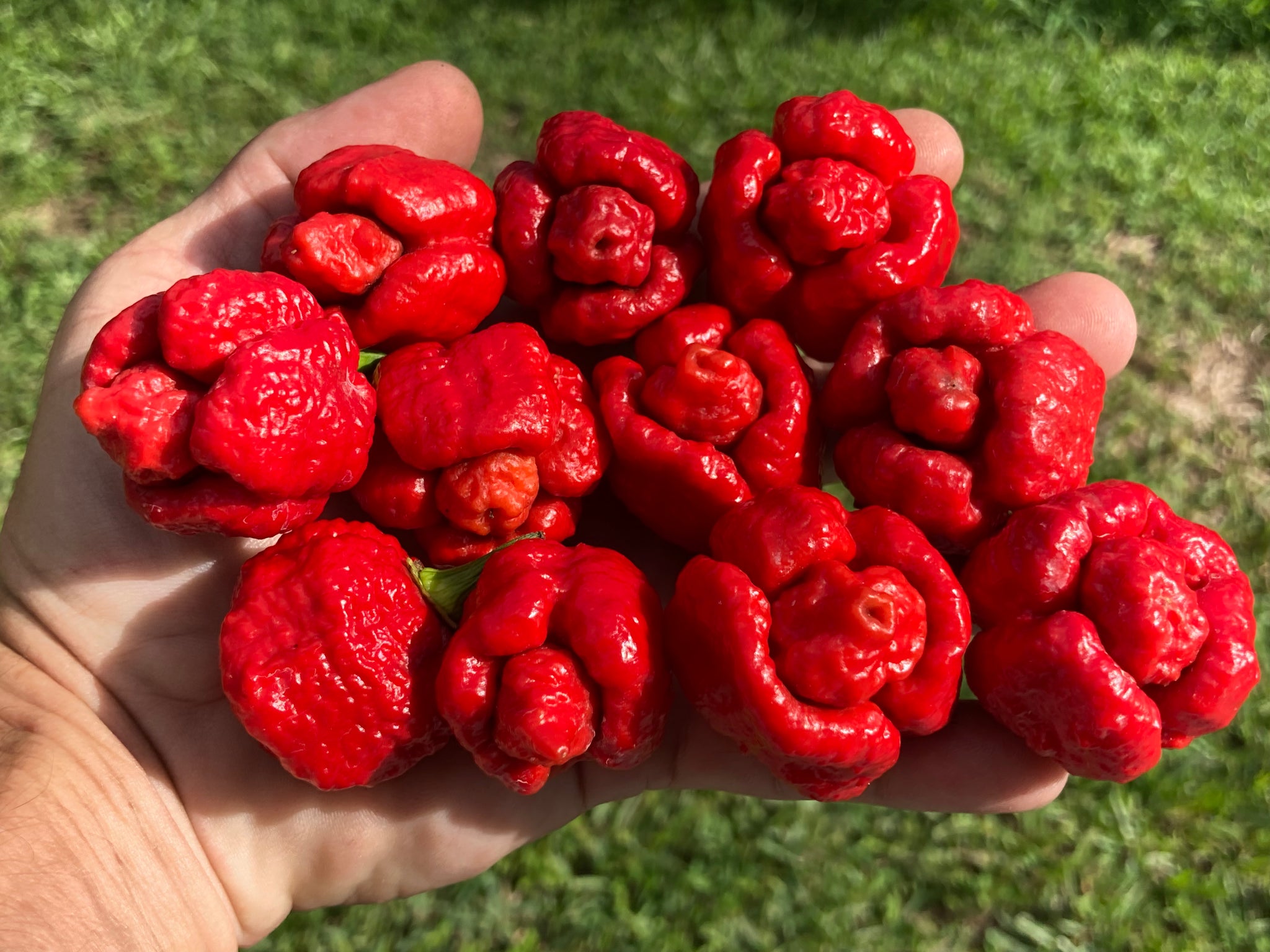 According to CARDI on the documentry "Crazy Hot", "Moruga Scorpion" does not exist. True "Moruga" are a smooth, blocky, Habanero type. When the gnarly bumpy "Moruga Scorpion" hit the scene there was even debates if 7Pod and Brainstrain were also one in the same. Christopher Phillips introduced them to the world as "Trinidad Moruga Scorpion Blend" from someone in Tobago, but the real beginnings are unknown. "Blend" got dropped off by growers over time. Genetic testing left more questions than answers when it showed very little relation to Scorpions. I have also had lead’s back to a hybrid from a CARDI employee and another small grower. It was likely a young cross that many selected different variations. This line of selection comes from Refining Fire Chiles who supplied the Chile Institute with the original testing material.